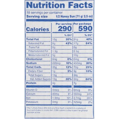 Duchess Honey Buns (each) Delivery or Pickup Near Me - Instacart Nutrition Nutrition Facts Serving Size 85.00 g Servings Per Container 12 Amount Per Serving Calories 340 % Daily Value Total Fat 16g 25% Saturated Fat 6g 30% Trans Fat 0g Cholesterol 0mg 0% Sodium 230mg 10% Total Carbohydrate 44g 15% Dietary Fiber 1g 4% Sugars 22g Protein 5g Percent Daily Values are based on a 2,000 calorie diet. Why Instacart?