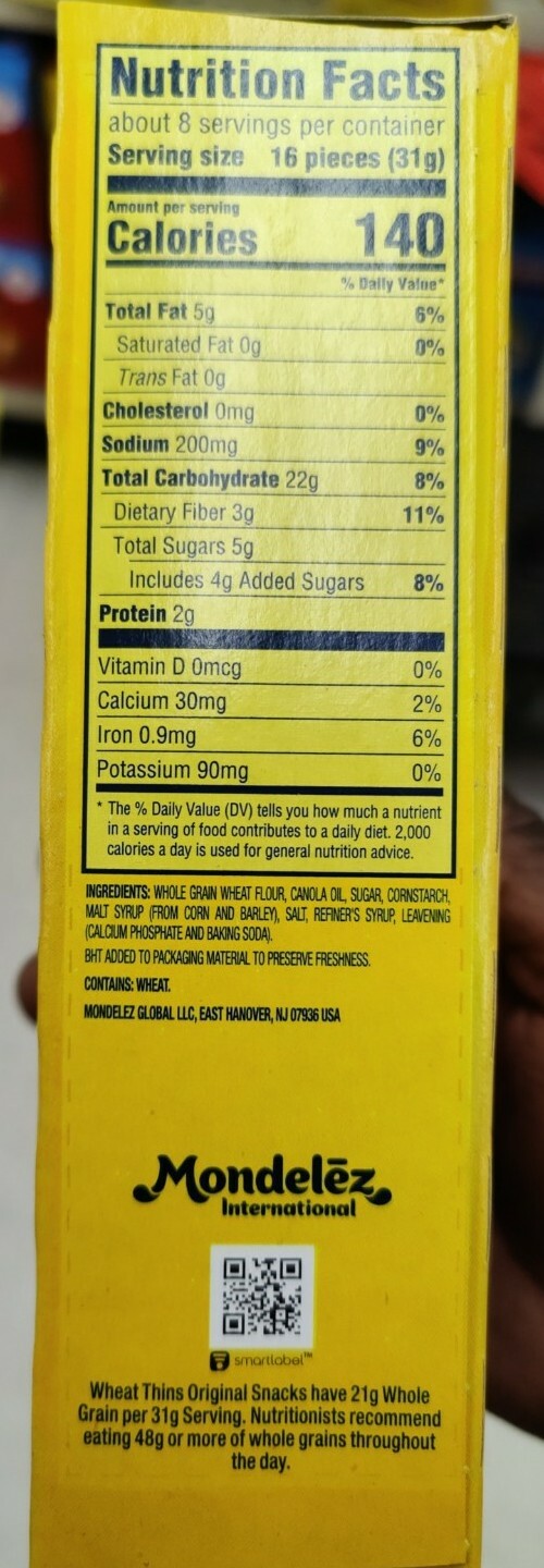 Nabisco Wheat Thins Original 9.1 oz - SmartLabel™ Nutrition Facts About 8 Servings Per container Serving Size 16 pieces (31g) Amount Per Serving Calories 140 % Daily Value * Total Fat 5 g 6.0% Saturated Fat 0.5 g 3.0% Trans Fat 0 g Cholesterol 0 mg 11.0% Sodium 200 mg 9.0% Total Carbohydrate 22 g 8.0% Dietary Fiber 3 g 11.0% Total Sugars 5 g Protein 2 g Vitamin D [Total (mcg)] 0.0% Calcium 2.0%