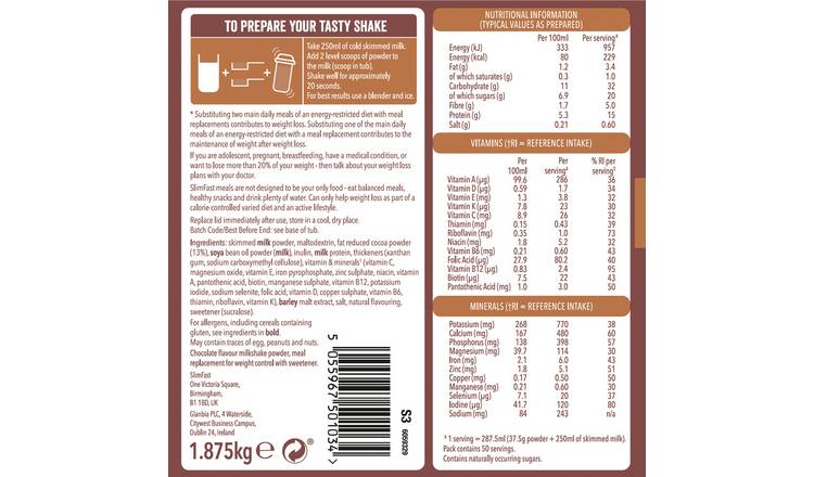 Slimfast shake nutrition label. SlimFast Original Shakes and Shake Mixes Packed with 10g of protein, 5g of fiber, and 24 vitamins and minerals, each weight loss shake is a total meal replacement solution, but tastes like an indulgent treat! It's Flexible! Available in both versatile shake mix powder and ready-to-drink shakes, SlimFast Original is easy to enjoy at home, work, or on-the-go. SlimFast Advanced Nutrition Creamy Chocolate Meal Replacement Smoothie ... SlimFast® Advanced has more protein§ with less sugar.† *When Used as Part of the SlimFast® Plan. Individual Results May Vary. §Double the Protein Compared to Original SlimFast Meal Replacement Shake Mix (as Prepared), 10g vs. 20g. †27.8% Reduction in Sugar Compared to Original SlimFast® Meal Replacement Shakes (as Prepared), 18g vs. 13g. SlimFast Advanced Nutrition High Protein Meal Replacement Shakes ... Packed with protein, vitamins & minerals - SlimFast Advanced Nutrition shakes contain 20g of protein, 1g of sugar and 24 essential vitamins and minerals Perfect for your on-the-go lifestyle. Part of the clinically proven SlimFast Plan - the SlimFast Plan offers flexibility and simplicity to make losing weight as easy as 1-2-3: Enjoy one sensible meal, two SlimFast meal replacements, and three snacks. SlimFast Diabetic Weight Loss Shake Mix Vanilla Milkshake Gluten free. Zero added sugar. See nutrition information for saturated fat content. Not a low calorie food. Helps manage carb & sugar intake! with the clinically proven SlimFast Plan (When used as a part of the SlimFast Plan (a reduced-calorie diet, regular exercise, and plenty of fluids). Read label prior to use.