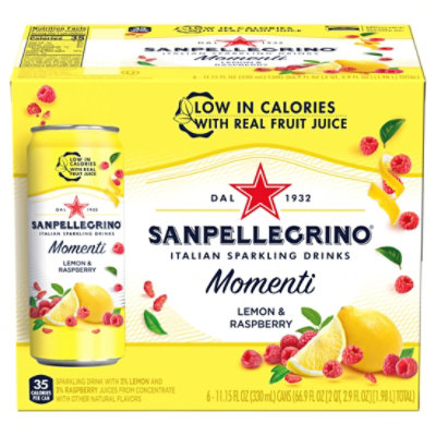 San Pellegrino Momenti Sparkling Drink Lemon & Raspberry - Stop & Shop Sparkling drink with 3% lemon and 3% raspberry juices from concentrate with other natural flavors. 35 calories per can. Low calorie. No artificial sweeteners. Real fruit juice. Dal 1932. For questions contact 1-800-255-8334 or sanpellegrinofruitbeverages.com.