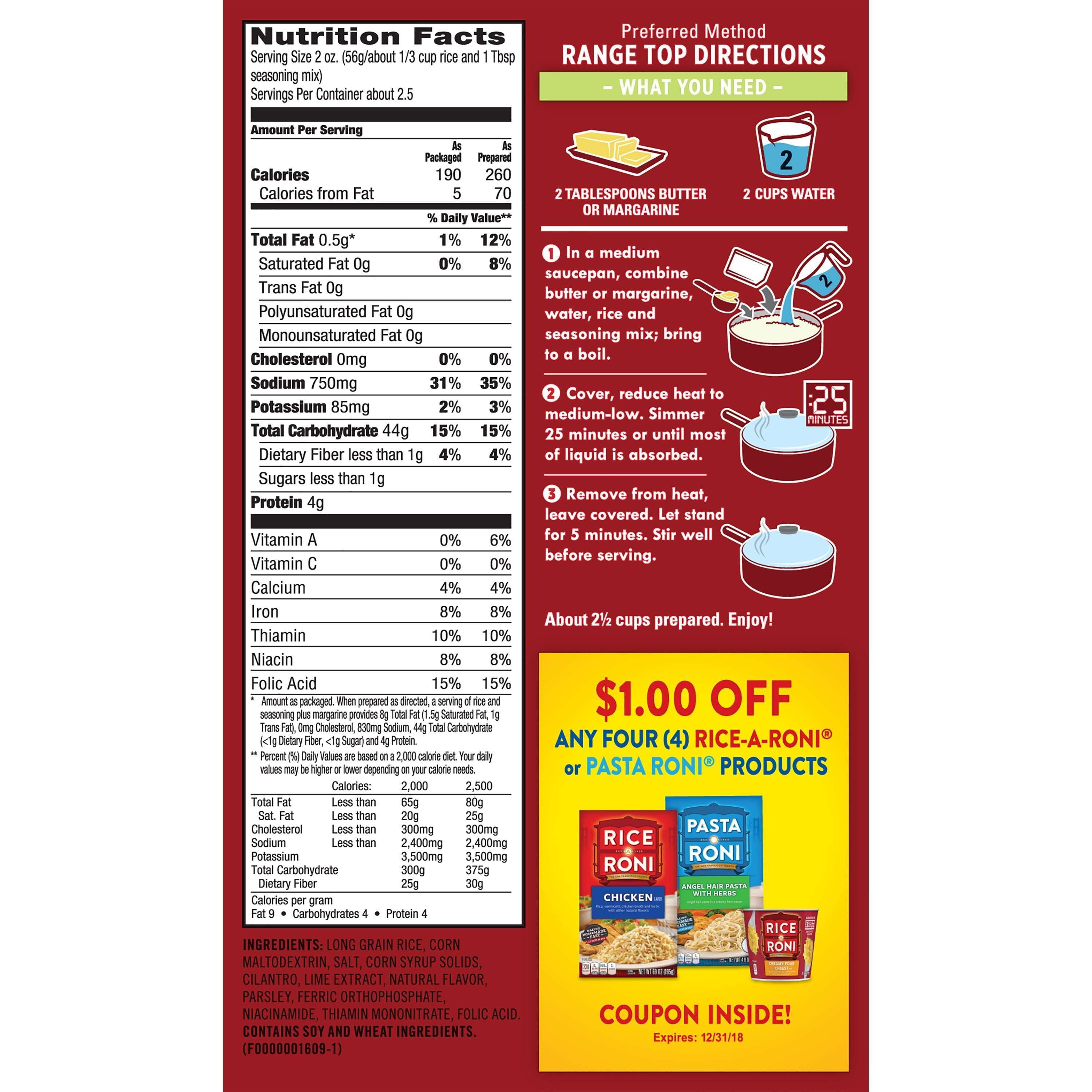 Calories in Rice-A-Roni Cilantro Lime Rice and Nutrition Facts - FatSecret Rice-A-Roni Cilantro Lime Rice Nutrition Facts Serving Size 1/4 cup (56 g) Amount Per Serving Calories 260 % Daily Values* Total Fat 8.00g 10% Saturated Fat 1.500g 8% Trans Fat 1.000g Polyunsaturated Fat 2.000g Monounsaturated Fat 3.500g Cholesterol 0mg 0% Sodium 840mg 37% Total Carbohydrate 44.00g 16% Dietary Fiber - Sugars - Protein 4.00g