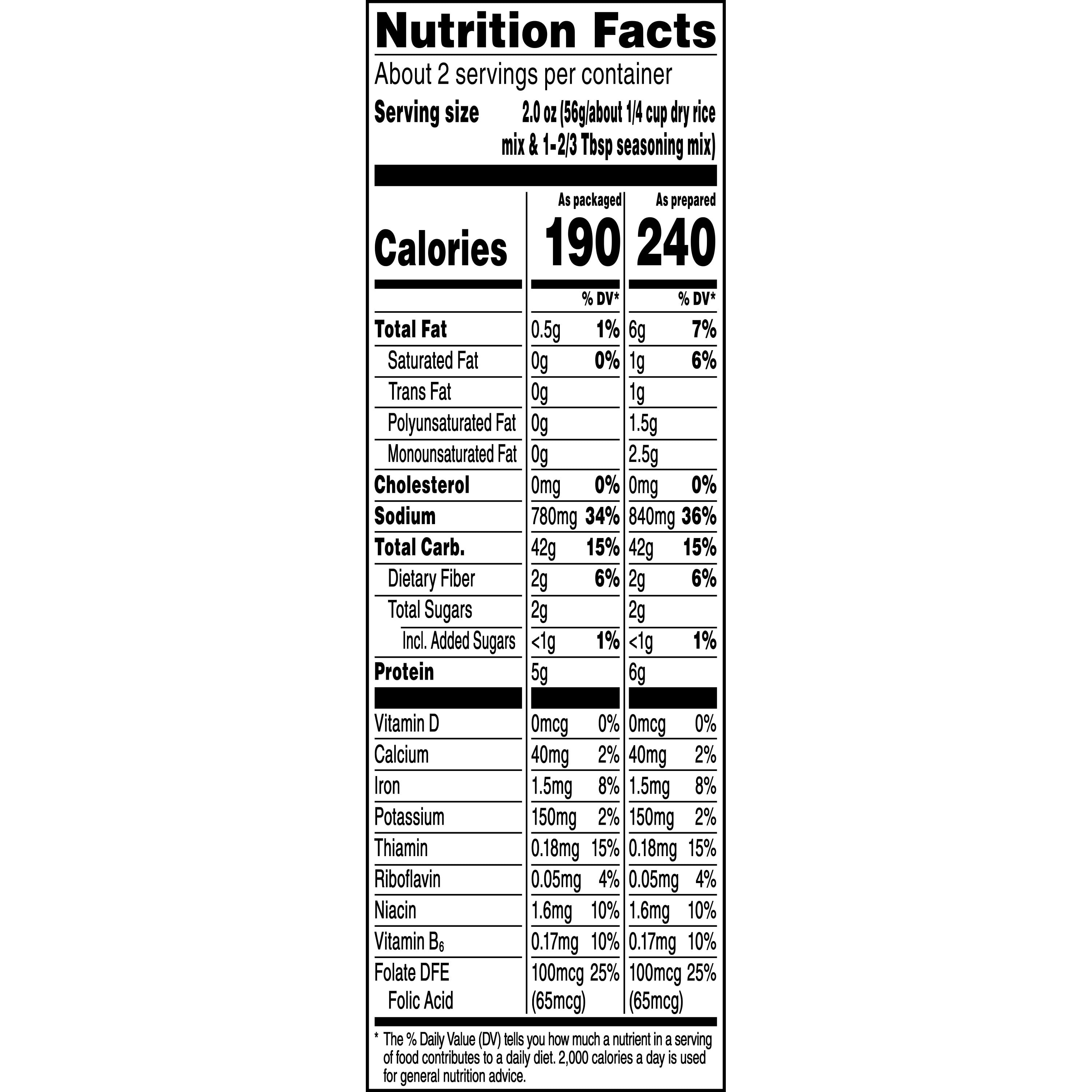 Rice A Roni Long Grain & Wild Rice - Fooducate Nutrition Serving Size: 2.0 oz Amount per Serving My Daily Value Calories 190 Kcal 11% Total Fat 0.5 g 1% Saturated Fat 0 g 0% Sodium 760 mg 33% Potassium 130 mg 3% Total Carbohydrate 13 g 6% Dietary Fiber 5 g 20% Added Sugars 0 g 0% Protein 5 g 10% Iron 0.6 mg 3% Ingredients
