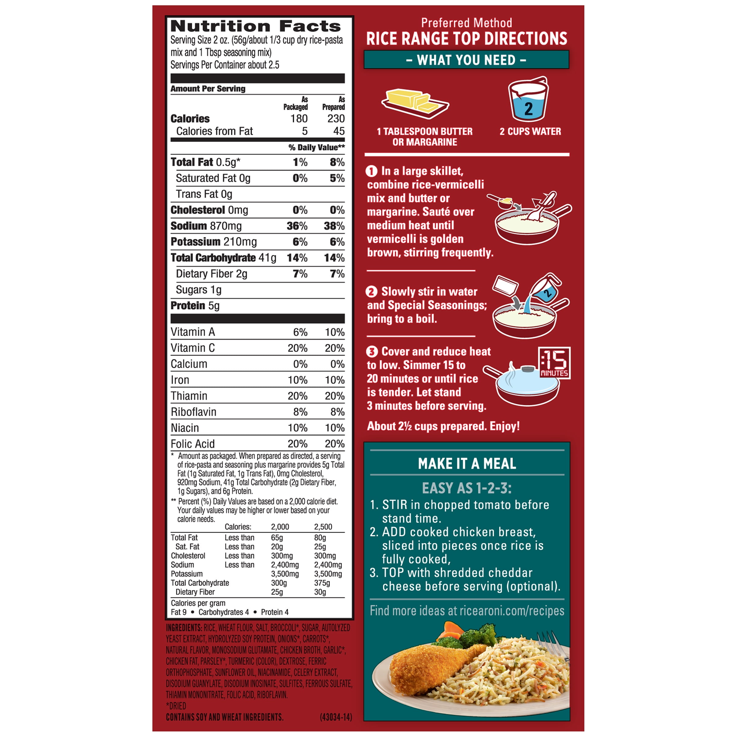 Rice a roni nutrition label. Rice A Roni Heat & Eat Rice, 3 Flavor Variety Pack, (6 Pack) About this item. Includes 6 microwaveable pouches of Rice A Roni Heat & Eat Rice: 2 pouches each of Herb & Butter, Spicy Spanish, and Garlic & Olive Oil flavors. Your ticket to deliciously fast flavors. Great taste in 90 seconds: squeeze the pouch, tear the top, heat on high, and enjoy. Perfectly pairs with veggies, chicken, steak, and more. Rice-A-Roni Nutrition Facts. Calories, carbs, fat, sodium & more ... Get nutrition information for Rice-A-Roni items and over 200,000 other foods (including over 3,500 brands). Track calories, carbs, fat, sodium, sugar & 14 other nutrients. ... Rice-A-Roni Rustic Recipes Rice - Long Grain & Wild Rice Prepared. 1 cup (56g) Nutrition Facts. 250 calories. Log food: How to Cook Buckwheat Kasha - NatashasKitchen.com 15.2.2015 · Buckwheat Nutrition info: Buckwheat is a great source of Potassium, Fiber, Protein, Iron, and Vitamin B6. It is also a good source of manganese, magnesium, copper, and zinc, which are great for the immune system. Yeah it’s definitely good for … Rice a Roni, Broccoli Au Gratin, 6.5 Ounce (Pack of 12) Nutrition summary 1.0 servings per container | 2.5 oz. (70g/about 1/3 cup dry rice-pasta mix and 3 Tbsp seasoning mix) Nutrition facts Ingredients About this item Rice with pasta, three cheeses and broccoli Just add meat to make it a meal Cooks in just 15 minutes 8 grams of protein per serving