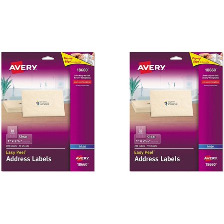 Avery 18660 Matte Clear Easy Peel Address Labels, Inkjet, 1 X 2 5/8 ... This item: Avery 18660 Matte Clear Easy Peel Address Labels, Inkjet, 1 X 2 5/8, 300/Pack $12.98 ($0.04/Count) Avery Printable Return Address Labels with Sure Feed, 2/3" x 1-3/4", Matte Clear, 600 Blank Mailing Labels (18695) $14.91 ($0.02/Count) Avery Printable Shipping Labels with Sure Feed, 2" x 4", Matte Clear, 250 Blank Mailing Labels (8663)