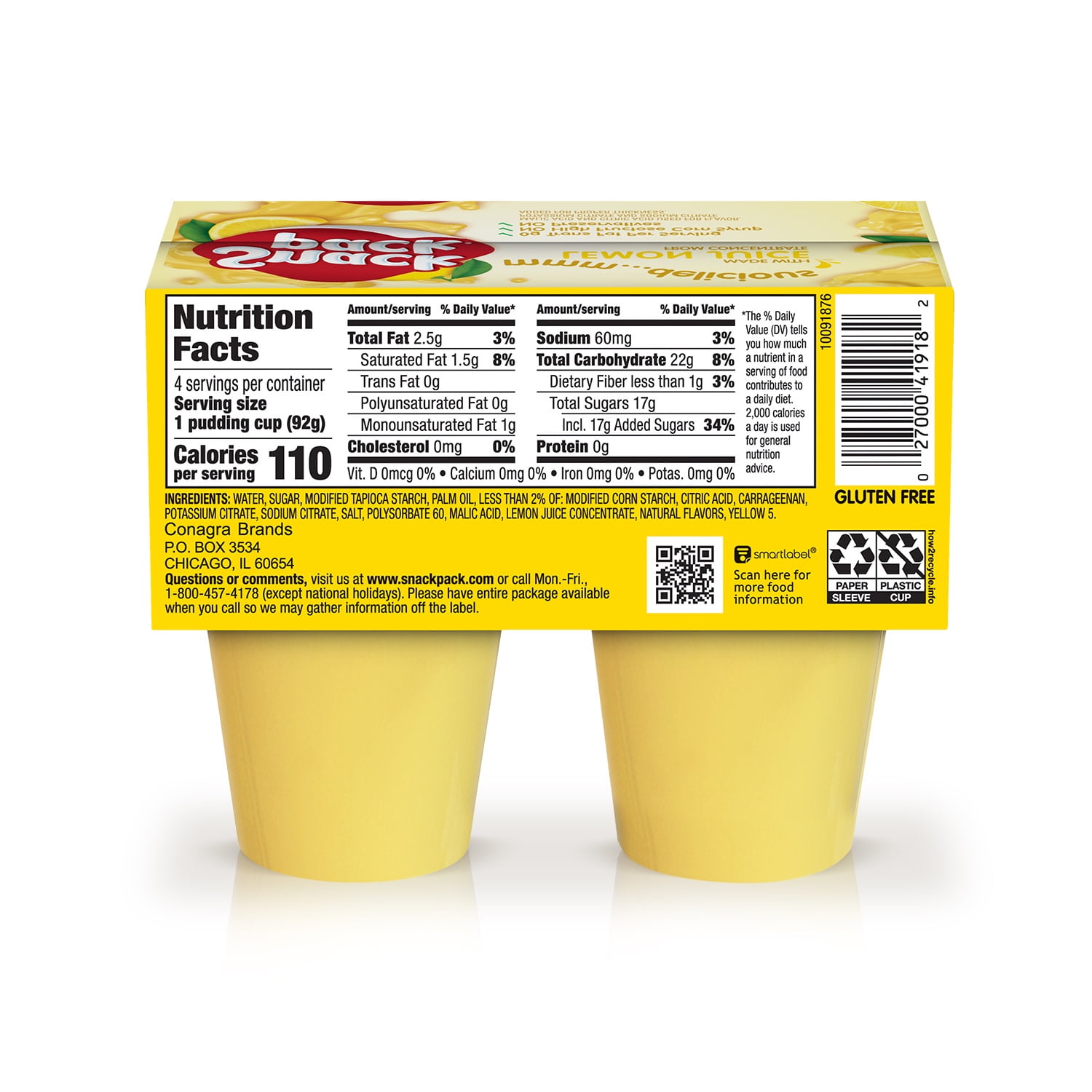 Snack Pack Vanilla Flavored Pudding, 4 Count Pudding Cups (12 Pack ... Nutrition facts. Refer to the product label for full dietary information, which may be available as an alternative product image. 4 Servings Per Container. Serving Size 92g. ... Vanilla Snack Pack Pudding Cups are gluten-free and Kosher, and are made with real milk so you can enjoy a smooth, creamy treat;