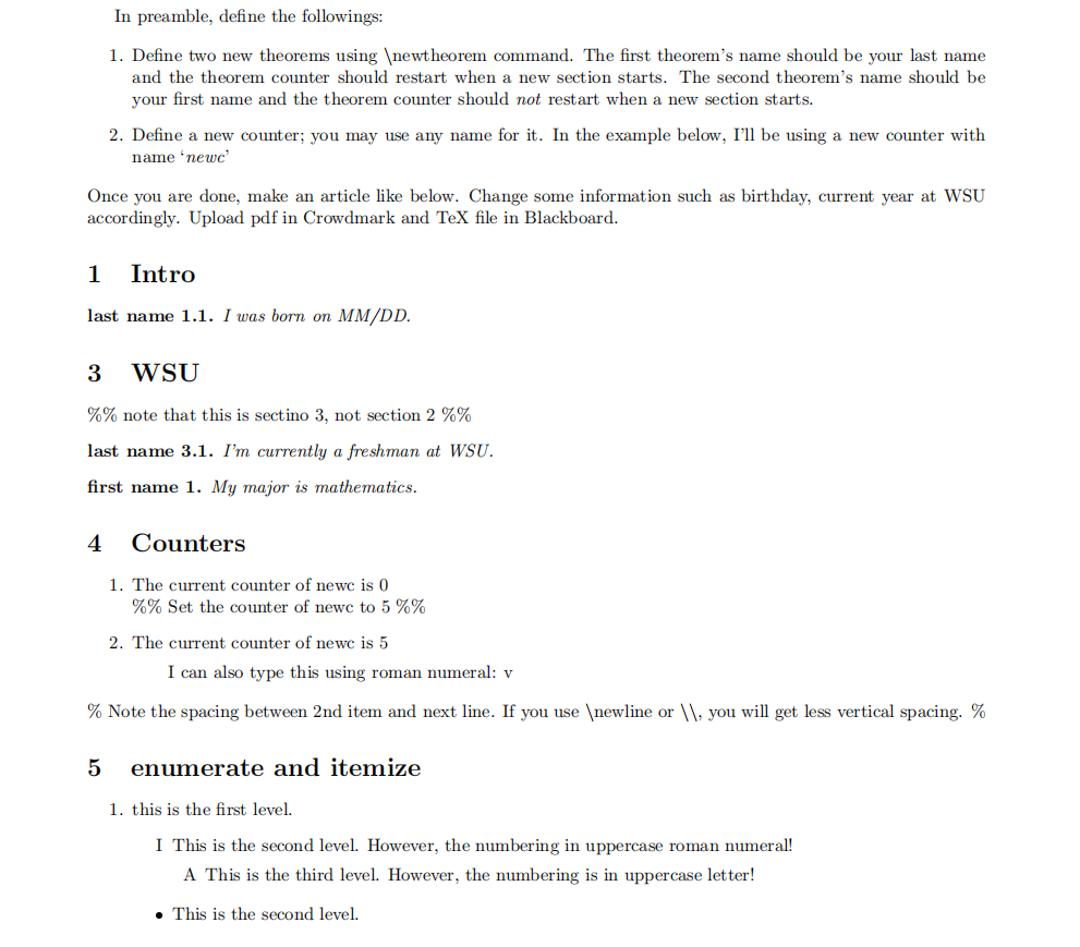 Lists - Overleaf, Online LaTeX Editor WebOpen this example in Overleaf. This example produces the following output: The enumerate environment for numbered (ordered) lists. Numbered (ordered) lists have the same syntax but use the enumerate environment: each entry must be preceded by the control sequence \item, which will automatically generate numbers to label the item.These numbers start at … Counters - Overleaf, Online LaTeX Editor WebOpen this LaTeX fragment in Overleaf. This example produces the following Output: \value{somecounter}This purpose of command, as described in the LaTeX source code, is “For accessing the value of the counter as a TeX number”: i.e., you use \value{somecounter} for situations where LaTeX is expecting to process a numeric value. … numbering - How do I change the `enumerate` list ... - LaTeX … WebSometimes I use linguex instead of the enumerate-like environments because the simple syntax list and because in not a closed environment, so you can insert normal paragraphs or even start a new section and follow with the same list.Unfortunately, the documentation show some indications to change the label and the counter value, but not the counter … Latex中enumerate的一些参数设置_zoujiahui_2018的博客-CSDN博客_late... Nov 04, 2018 · 调整 LaTeX 中的列表环境时,使用 enumitem 宏包可以方便的调整间距。调整间距的参数命令包括两类。 1. 垂直间距 topsep 列表环境与上文之间的距离 parsep 条目里面段落之间的距离 itemsep 条目之间的距离 partopsep 条目与下面段落的距离 2.