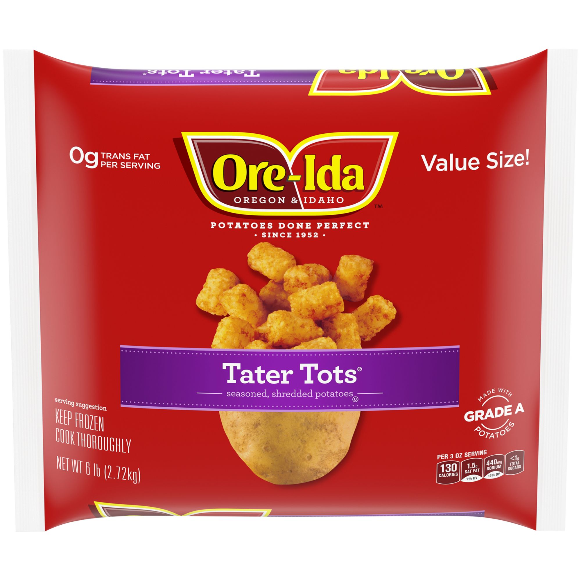 Ore-Ida Golden Tater Tots Seasoned Shredded Potatoes ... Per Serving: 130 calories; 1.5 g sat fat (7% DV); 450 mg sodium (19% DV); less than 1 g total sugars. Gluten free. Oregon & Idaho. Potatoes done perfect. Since ... Golden TATER TOTS ... Ore-Ida potato experts have been serving locally grown taters from the ... Calories. 130KCAL. Calories From Fat. 0. % Daily Value*. Total Fat 8G. Potato Ore-Ida Tater Tots Nutrition Facts Potato Ore-Ida Tater Tots. Product Information ... Nutrition Facts. Serving Size: ½ cup (2.52 oz.) Amount Per Serving. Calories 130. Calories from Fat 55.